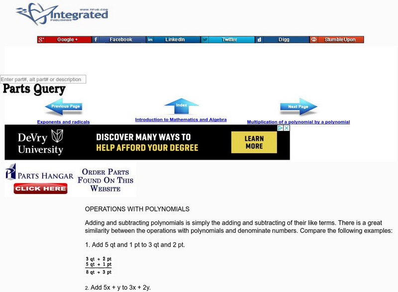 Varsity Tutors: Hotmath: Practice Problems: Adding, Subtracting and Multiplying Polynomials