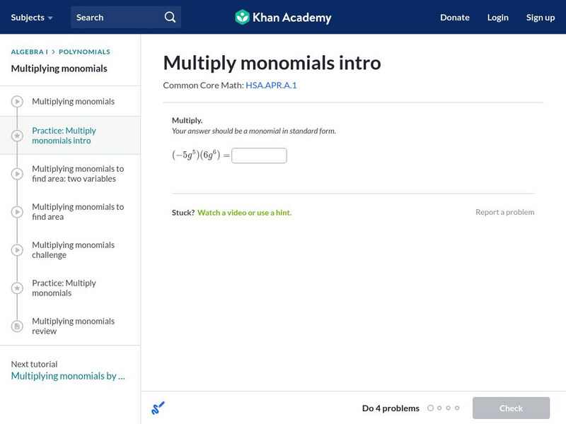 Express the product of two monomial expressions as a single monomial. Students receive immediate feedback and have the opportunity to try questions repeatedly, watch a video or receive hints.