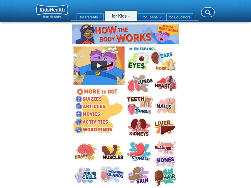 For elementary school children, this page presents information about lungs, muscles, digestive system, teeth, skin, tongue, hair, heart, and more.