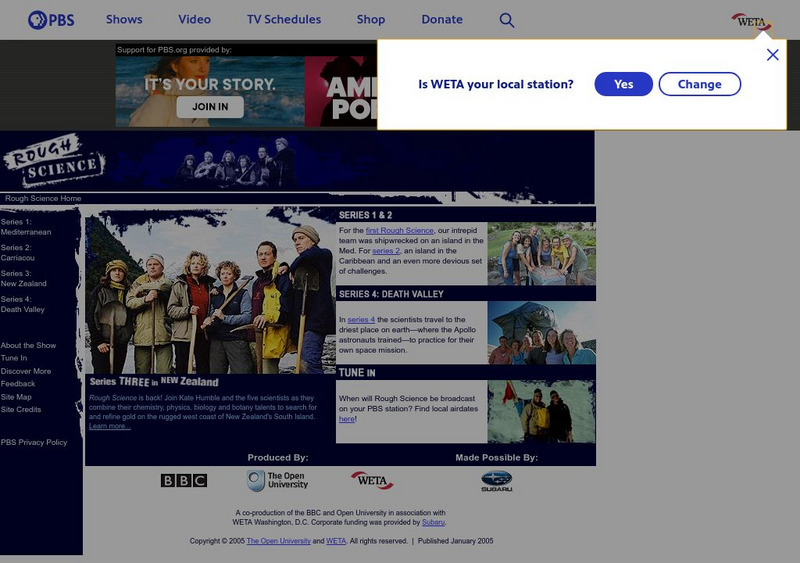 Website companion to PBS show, "Rough Science," in which five scientists use their collective expertise to complete a series of tasks. Follow the scientists as they do things like generate electricity, make soap, make antibacterial...
