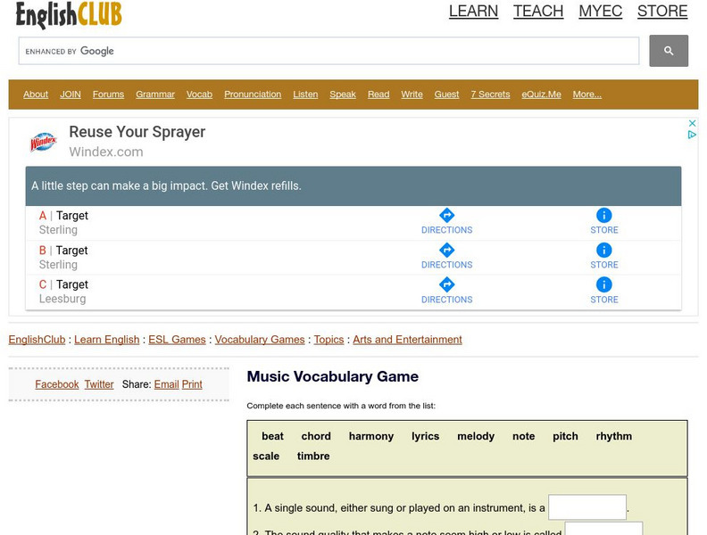 Choose from a word bank to complete ten sentences about musical terms. Hints are available if needed, and a percentage score is displayed once answers are submitted.