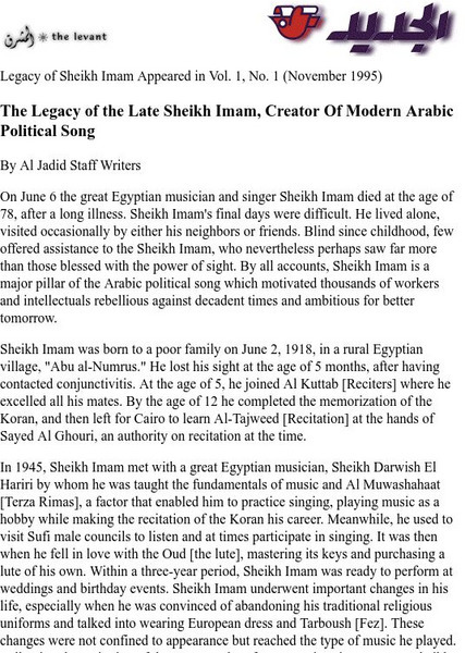 In this obituary-type article, Sheikh Imam's life and musical work are recounted. He is recognized as the "Creator of Modern Arabic Political Song," and the article credits his music with helping the political movements in the Arab world...