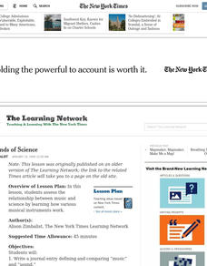 Sound, vibrations, resonance, and frequency are explored as learners use music to foster scientific inquiry. They engage in three different sound experiments and follow up discussions to foster a better understanding of how musical...