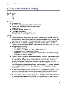 A basic lesson on personal narrative writing is here for you. In it, learners are asked to imagine they're going to share an experience of their own with someone who did not participate in that experience. They verbally tell the story to...