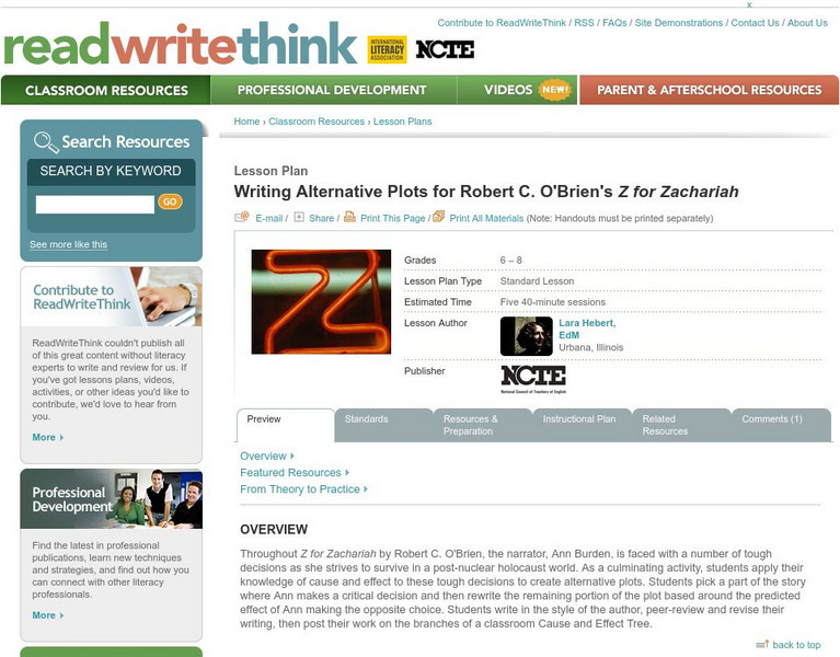 Read Write Think: Writing Alternative Plots for Robert O'brien's Z for Zachariah
