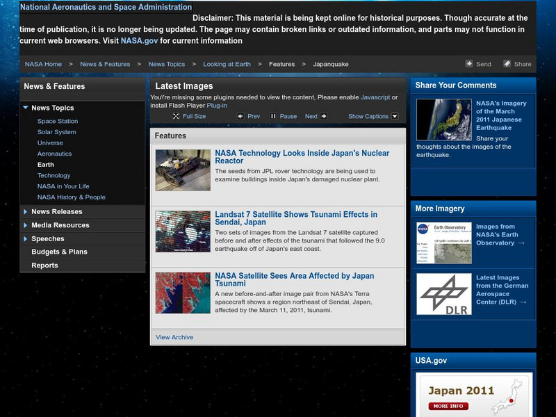 NASA provides technical calculations on the 9.0 quake and tsunami that hit Japan in March, 2011. Find satellite images, as well as narrative on the effects of the quake on Japan and the Earth itself.