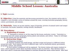 Using their discussion notes Middle schoolers engage in a series of learning centers. Each center focuses on a different aspect of Australian geography, history, government, culture, and natural environment. Activities are briefly...