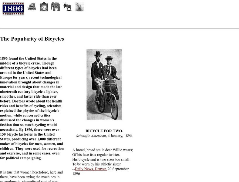 As part of the larger site about the year 1896, this article describes the bicycle craze at the end of the 19th century and includes newspaper articles and cartoons about this fad.