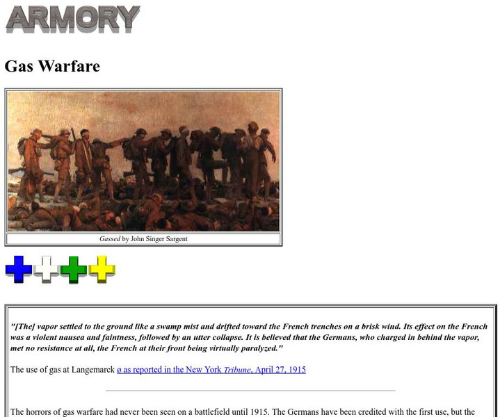 Detailed information on the use of chemicals as weapons during WWI. Includes images of soldiers wearing gas masks, an extensive list of chemicals and their effects, and links to further information on the Second Battle of Ypres and to...
