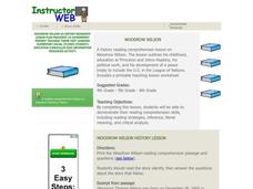 Learners practice their reading comprehension skills by reading about Woodrow Wilson. They answer questions about the story to test for comprehension.