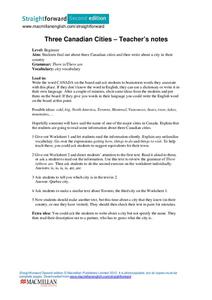 Students, after brainstorming all the words they can associate with the word Canada, investigate and study about three Canadian cities and then write about a city in their country. They complete a worksheet on unfamiliar vocabulary words...