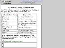 Explore collective nouns with this worksheet. Learners discover what collective nouns are and describe groups of animals by using the word bank to fill in the blanks in 9 sentences. Class members are also encouraged to create their own...