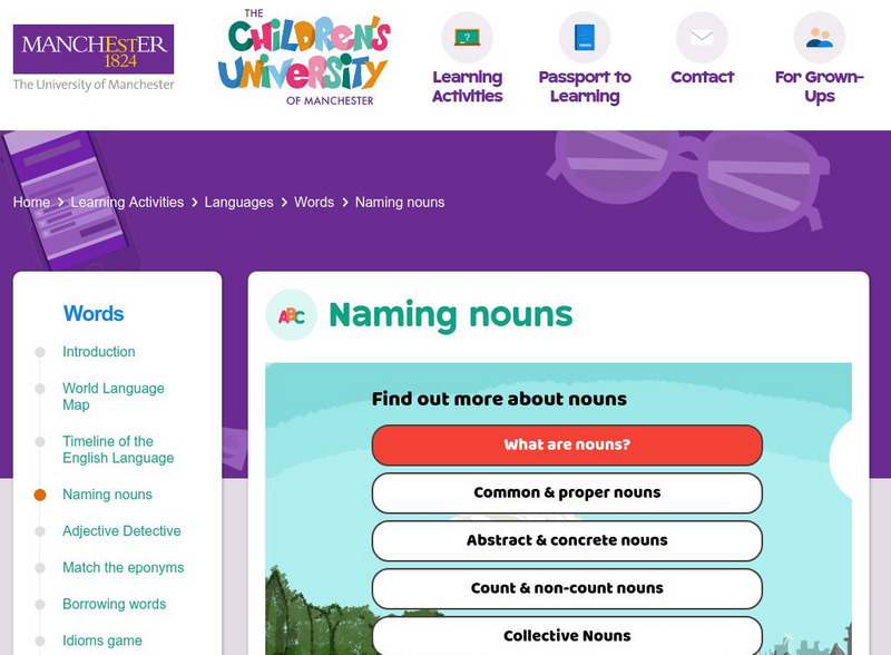 In these interactive lessons you can learn all about different types of nouns including common, proper, concrete, abstract, count, non-count, and collective. Then play a noun game and take a quiz to show what you have learned.