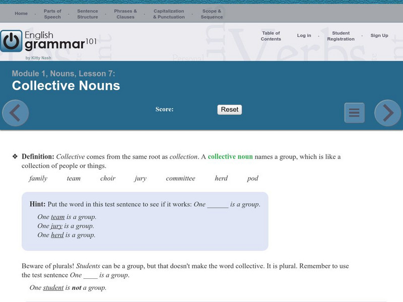 This site provides a resource related to collective nouns. Numerous examples are provided, along with an multiple-choice interactive quiz.