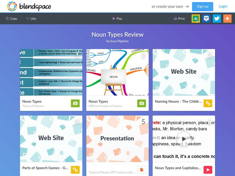 A six-part learning module with links images, websites, slides, and a video on different types of nouns including common, proper, collective, verbal, compound, abstract, concrete, countable, and uncountable.