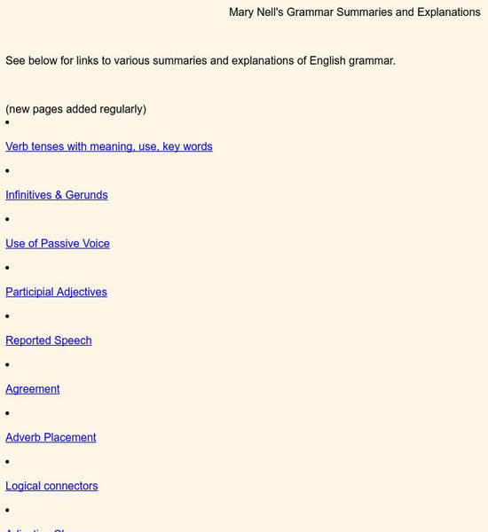 The University of Washington provides an excellent collection of grammar-related summaries. The collection includes material on verb tenses, agreement, noncount nouns, and many other topics.