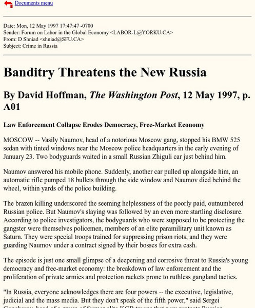 An article about threats to Russia's free-market economy and the breakdown of law enforcement.
