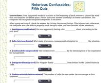 In this similar words worksheet, students complete a 10 question multiple choice on-line interactive quiz about words that are easily confused. Students choose the best word to complete each sentence from 2 similar words. Example:...