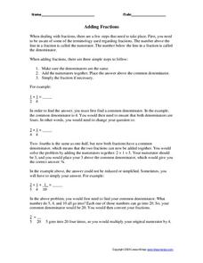 In this fractions worksheet, students learn how to add 2 fractions together. They first read an explanation of how to solve these problems, which includes example problems. Students then solve the 6 fraction addition problems in the...