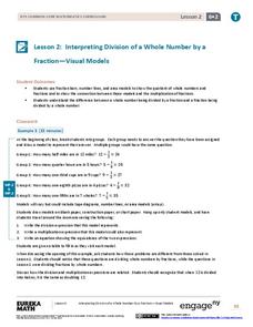 Connect division with multiplication through the use of models. Groups solve problems involving the division of a whole number by a fraction using models. The groups share their methods along with the corresponding division and...