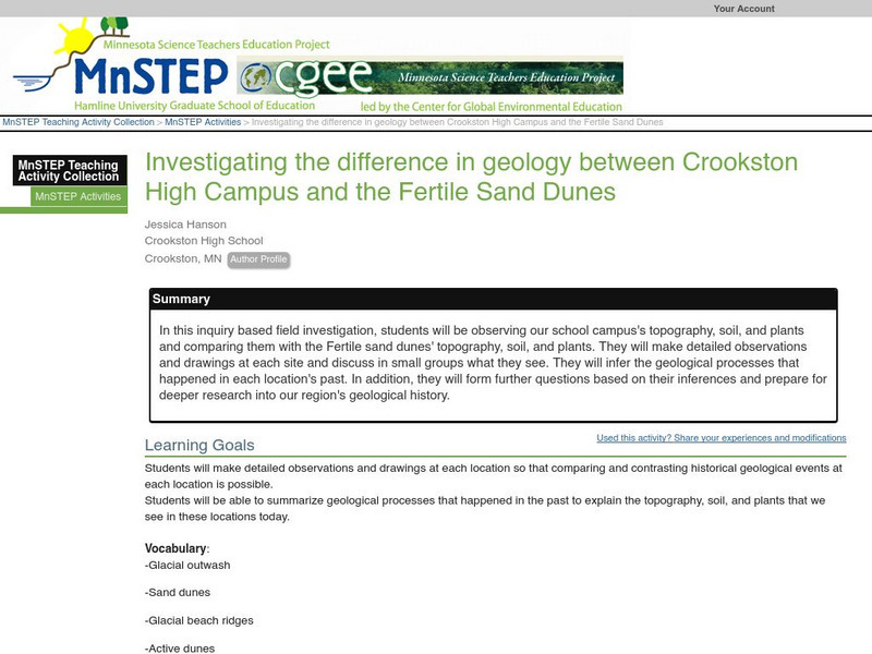 In this inquiry based field investigation, students will be observing our school campus's topography, soil, and plants and comparing them with the Fertile sand dunes' topography, soil, and plants. They will make detailed observations and...