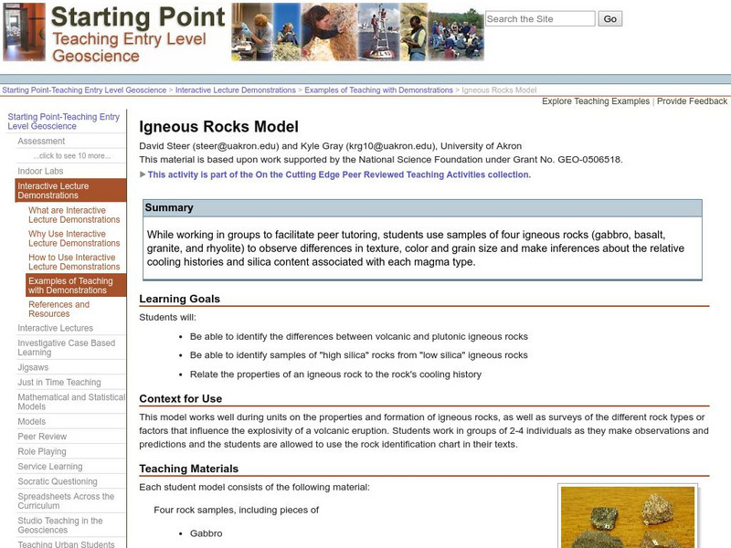 Students use samples of four different types of igneous rocks to observe differences in texture, color, and grain size, and then make inferences about the relative cooling histories and silica content associated with each magma type.