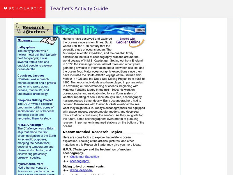 Good starting point for researching ocean life. Find general information, research-topic ideas, a glossary of important terms and people, and numerous links to related sites.