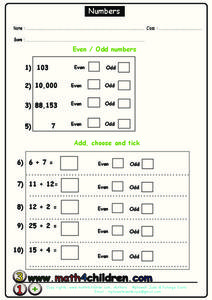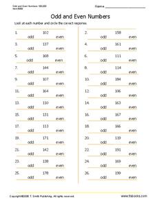 For this mathematics worksheet, students look at each number and circle the correct response. They identify whether the number given for each problem is odd or even.