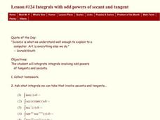 Twelfth graders solve equations containing powers of sec and tan. In this caclculus lesson plan, 12th graders integrate integrals that have odd powers of trig functions. They use trig substitution to solve these problems.