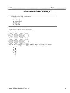 In this math worksheet, 3rd graders complete multiple choice questions about fractions, evens and odds, decimals, and more. Students complete 20 questions.