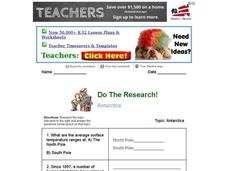 In this Antarctica research worksheet, students research Antarctica, then complete 4 short answer questions. Worksheet contains a link to additional activities.