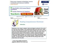 In this comprehension worksheet, students read a short passage about Antarctica, then complete 3 short answer questions. Worksheet contains link to additional activities.