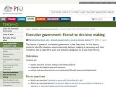 Students explore executive decision making in the federal Cabinet. They are able to explain the need for executive decisions. Students explore how executive decisions are implemented through government departments.