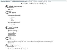 Students draw a net (a two-dimensional pattern that can be formed to make a solid) for making an open top box on grid paper. They cut out the net and fold up each side to form the open box and tape the sides, then find the volume of the...