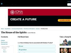 For this online interactive reading comprehension worksheet, students respond to 25 multiple choice questions about Isabel Allende's The House of the Spirits. Students may submit their answers to be scored.