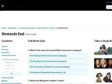 In this online interactive reading comprehension activity, students respond to 25 multiple choice questions about E.M. Forster's Howard's End. Students may submit their answers to be scored.