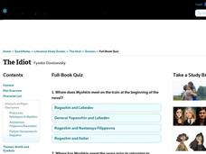 In this online interactive reading comprehension learning exercise, students respond to 25 multiple choice questions about Dostoevsky's The Idiot. Students may submit their answers to be scored.