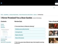 In this online interactive reading comprehension worksheet, students respond to 25 multiple choice questions about Joanne Greenberg's I Never Promised You a Rose Garden. Students may submit their answers to be scored.