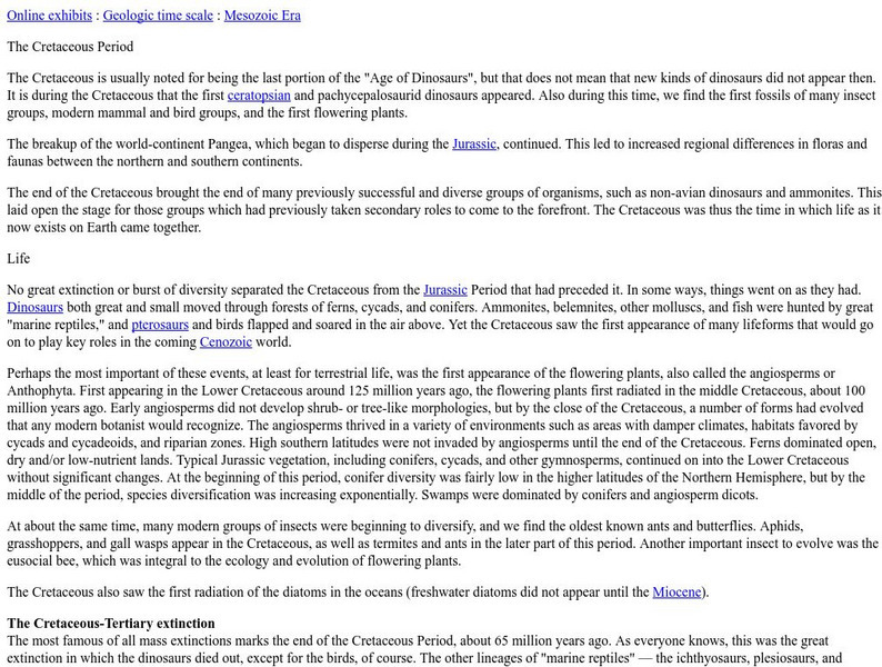 This site from the UCMP Berkeley provides information about the Cretaceous Period, the last portion of the age of the dinosaurs and the continued break up of the continent of Pangaea.