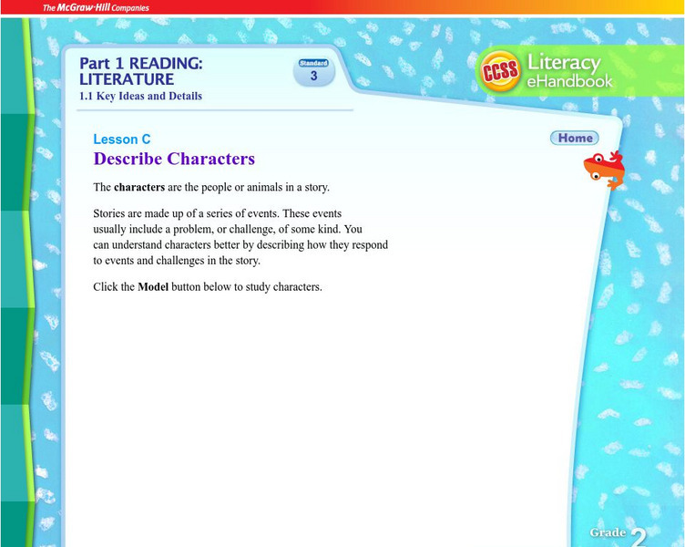 This learning module focuses on reading for key ideas and details including main characters, problems, and solutions. It provides a detailed example with an explanation and a practice paragraph with questions.