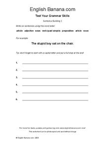 In this sentence building worksheet, students write 6 sentences using the given grammar elements. Students include articles, adjectives, nouns, verbs, and prepositions.