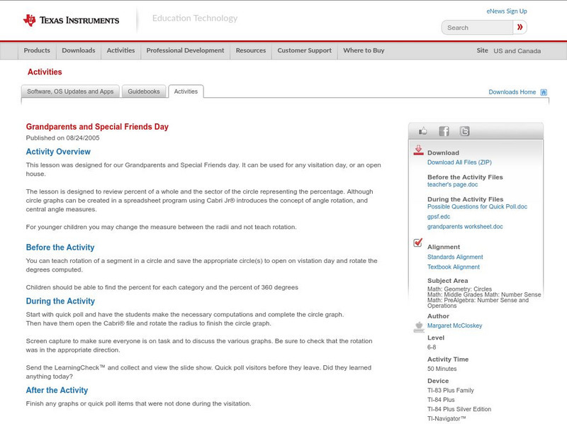This lesson was designed for our Grandparents and Special Friends day. It can be used for any visitation day, or an open house. The lesson is designed to review percent of a whole and the sector of the circle representing the percentage....