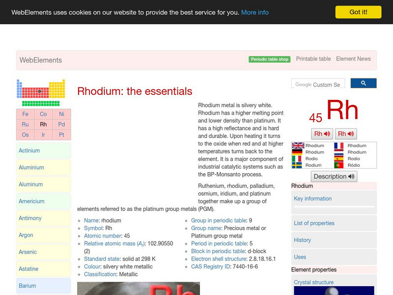 This WebElements Periodic Table site offers an excellent summary of data on rhodium, its description and properties.