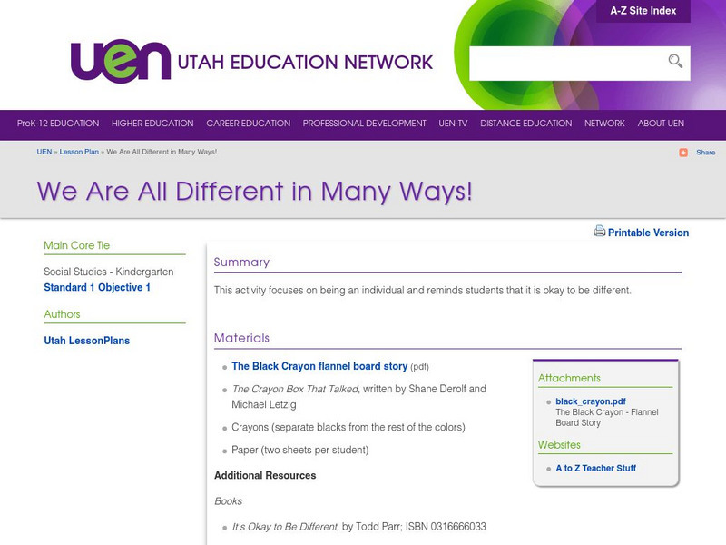 This lesson celebrates students's unique physical and personality traits. After reading and discussing the children's book The Crayon Box That Talked by Shane Derolf and Michael Letzig, students will share create their own artwork that...