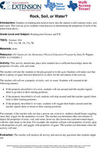 Students participate in an activity in which they identify properties of water, soil and rocks. They work together to identify different types of rocks. They ask questions to complete the instructional activity.