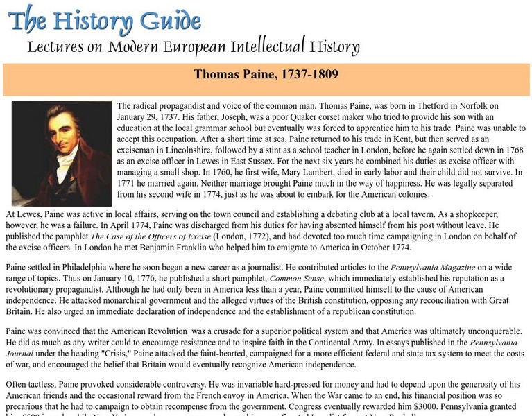 An in-depth profile of Thomas Paine and discussion of his literary works. Includes links to e-texts of his writings.