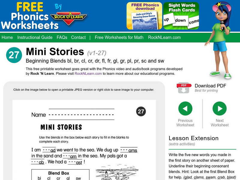 This printable consonant blends worksheet from Rock 'N Learn can be used as a reinforcement activity or as an assessment. Students will add initial consonant blends [ bl, br, cl, cr, dr, fl, fr, gl, gr, pl, pr, sc and sw] to form words...