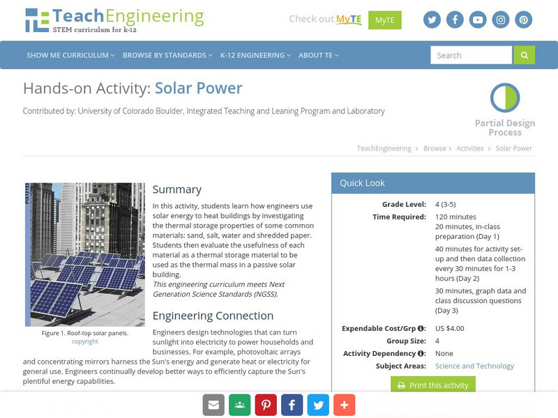 In this activity, students learn how engineers use solar energy to heat buildings by investigating the thermal storage properties of some common materials: sand, salt, water and shredded paper. Students then evaluate the usefulness of...
