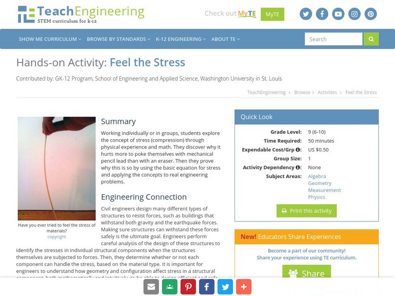 Working individually or in groups, students explore the concept of stress (compression) through physical experience and math. They discover why it hurts more to poke themselves with mechanical pencil lead than with an eraser. Then they...