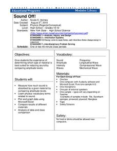 Time to witness the effects of sound. Learners analyze different materials to determine their abilities to absorb sound waves. They use free software to monitor the amplitude of the waves to verify results.
